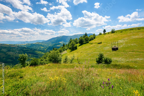 grassy pasture on the hill in summer. empty hay shed on the field. carpathian rural landscape in mountains on a sunny day. sky with clouds above the distant ridge