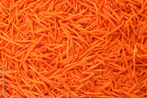 Grated Carrots Background is Spinning. Fresh Juicy Chopped Carrots. Food Orange Color Backdrop. Shredded Carrot Abundance is Rotating. Crushed, Cut Vegetables for Soup, Garnish, Salad. Healthy Eating