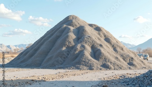 gravel, pile, road, to sit, stack, industrial, heavy, day, neutral, calm, bright, scene, landscape, mountain, sky, cloud, distant, vehicle, tree, horizon, construction, material, surface, aggregate, earth, ground, path, background, paving, driveway, building, transport