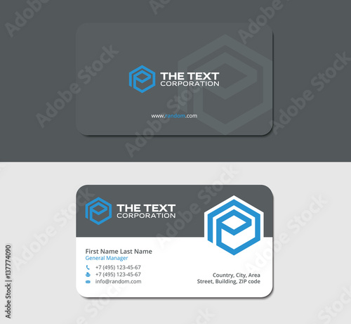 gray business cards with blue hexagon, print template, branding and brand, letter p