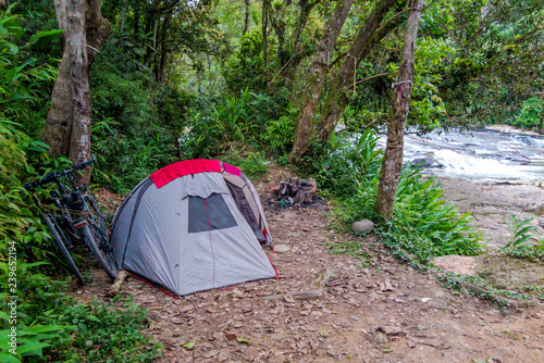 Gray camping tent with two bicycles next to a river in the middle of the forest, Presidente Nereu, Santa Catarina