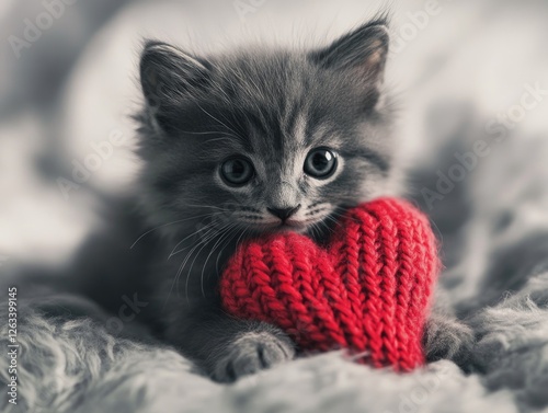 Gray Kitten Holding Knitted Heart