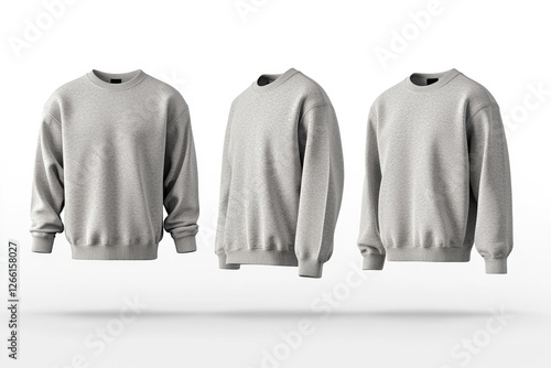 Gray sweatshirts from three different angles on a white background