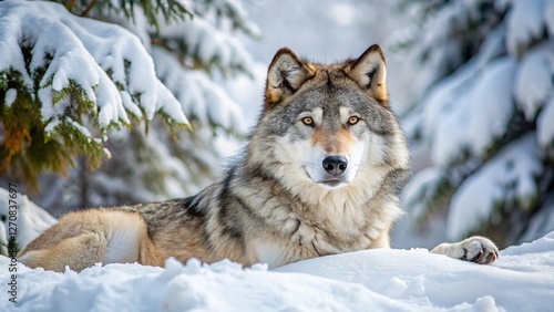 Gray wolf (Canis lupus) lays in the fresh fallen snow of the International Wolf Center in Ely, northern Minnesota, USA; Ely, Minnesota, United States of America