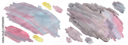 Gray, yellow, lilac watercolor spots on a white background. The artistic texture is suitable for the banner. Hand-drawn abstract illustration for the cover of a greeting card, decoration, color backgr