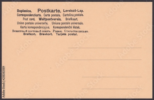 Gray-beige cardboard background, the reverse side of the old postcard with inscriptions in different languages, circa 1910