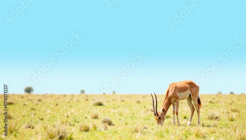 Grazing antelope under clear blue sky in vast savanna, natural habitat
