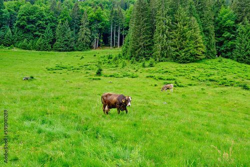 Grazing brown cattle in the Allgaeu Alps near Oberstdorf in Bavaria, Germany, Europe.