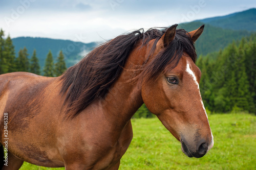 Grazing horse at high-land pasture at Carpathian Mountains after rain. Picture of beautiful green pasture on a background of mountains.