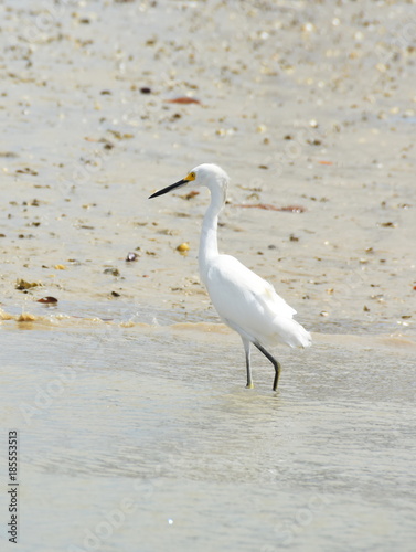Great white egret Ardea alba egretta standing on a shore hunting fish