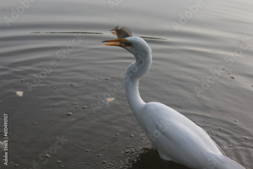 Great white egret (Ardea alba). Great white egret fishing on a mountain lake.