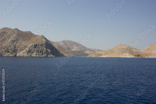 Greece. Rhodes island. Rest at the sea. Euro-trip. Sea water surface. Mountains in the background.