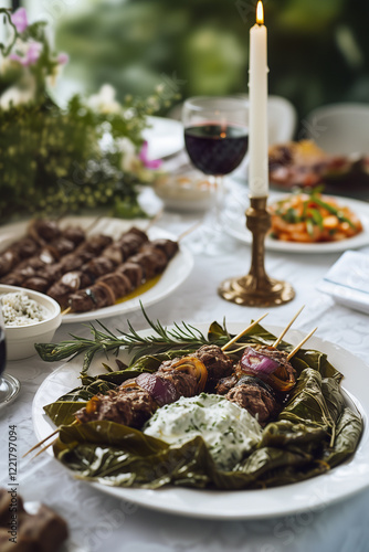 Greek food with stuffed grape leaves, tzatziki sauce, grilled kebabs, pita triangles, space for text