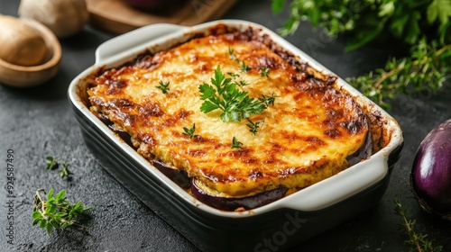 Greek moussaka with layers of eggplant, minced meat, and sauce in a baking dis