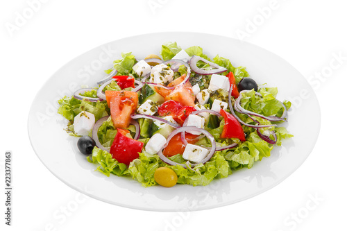 Greek salad with feta, olives, lettuce, red onion, cucumber, tomato, bell pepper, oil on plate, white isolated background Side view. For the menu, restaurant bar cafe