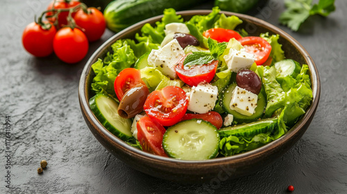 Greek salad with tomatoes, cucumber, olives, and feta cheese, refreshing and healthy food
