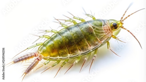 crustacean, invertebrate, aquatic, animal, insect, macro, photo, closeup, isolated, white, background, studio, detail, nature, wildlife, fauna, biology, zoology, science, specimen, research, transparent, green, leg, antennae, body, segmented, carapace, small, microscopic, sharp, image, object, single, view, dorsal, lateral, top, bottom
