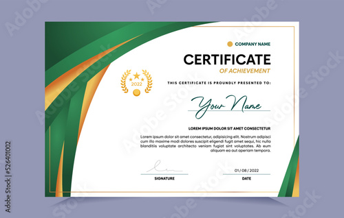 Green and gold certificate of achievement template set with gold badge and border. For award, business, and education needs. Vector Illustration