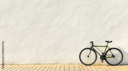 green bicycle rests against smooth white wall, showcasing minimalist aesthetic. scene evokes sense of calm and simplicity, perfect for urban exploration