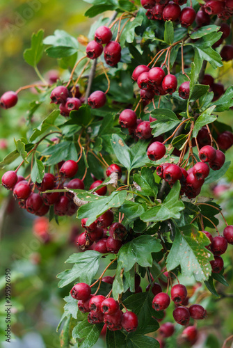 Green branches of hawthorn strewn with red berries.