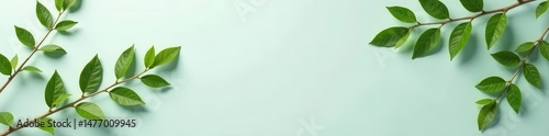 Green branches with leaves, light grey background Minimal eco summer flat lay , background, bright, cosmetic