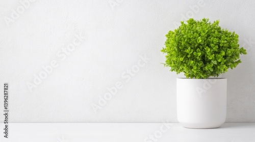 Green Bush in White Pot Minimalist Style High-Resolution Soft Lighting Horizontal Close-up View Lush Foliage Peaceful Display White Wall Background Bright Green Tones Ideal for Home Decor