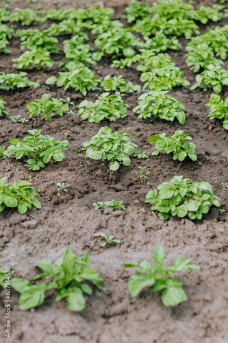 Green bushes of potato plant grow in the garden. Photography, nature, growing food, agriculture.