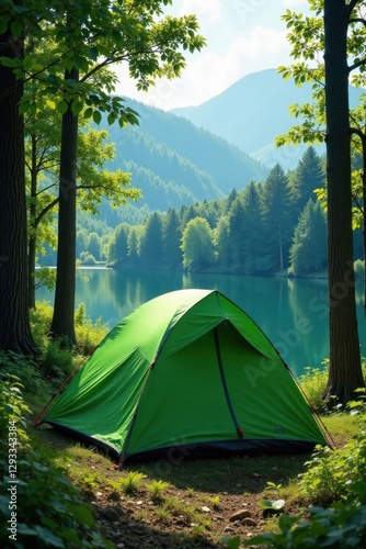 Green canvas tent pitched near river, forest backdrop, peaceful, trail
