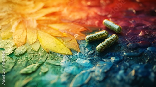 pill, capsule, medicine, health, health care, treatment, therapy, pharmacy, drug, medicals, wellness, colourful, vibrant, abstract, background, art, texture, paint, canvas, oil, acrylic, green, yellow, orange, red, purple, blue, closeup, macro, photo, still, life, supplement, herbal, natural, alternative, holistic, recovery, care, healing, vitamin, nutrient, lifestyle, healthy, bright, high-coloured, energy, botanical