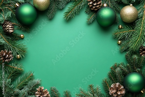 christmas, ornament, green, frame, teal, background, pine, cone, holiday, festive, winter, decoration, design, christmas, celebration, season, greeting, card, template, image, border, overhead, photo, space, copy, text, illustration, graphic, joyful, merry, happy, december, new, year, seasonal, christmas tree, gift, present