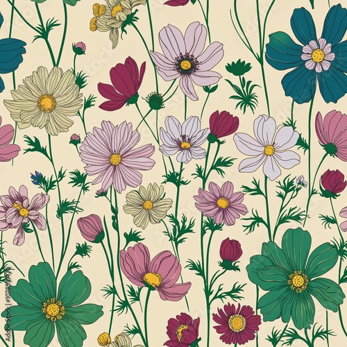 green, cosmos, flower, pattern, design, illustration, plain, background, seamless, wallpaper, print, floral, vector, nature, decoration, spring, summer, art, texture, leaf, flower, textile, plant, vintage, blossom, ornament, garden, fabric, hibiscus, pink