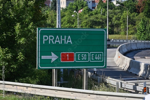 Green direction sign at the turn on the D1 highway from Brno to Prague, Czech Republic