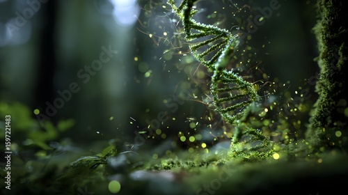 Green DNA strand in forest with light particles, symbol of genetic research and medical advancement