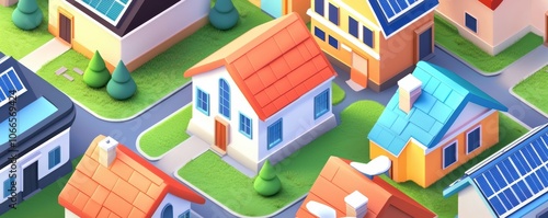 Green energy district, residential buildings with solar panels, wind turbines in parks, 3D illustration