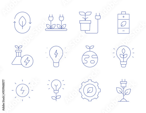 Green energy icons. Thin Line style, editable stroke. solar energy, sustainable energy, biomass energy, save energy, green energy, gear, energy, green earth, light bulb, innovation
