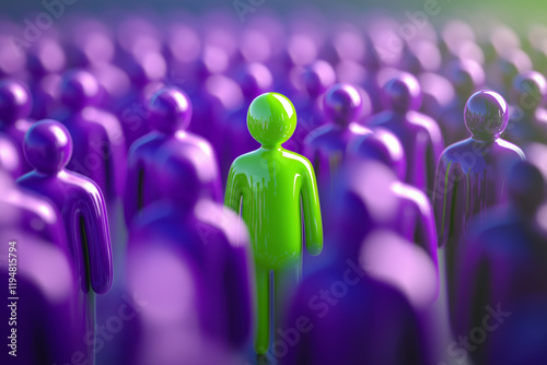 Green Figure Standing Out in a Sea of Purple Figures Symbolizing Leadership, Individuality, and Distinction in Team Dynamics and Recruitment