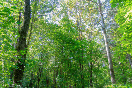 Green forest with lush summer foliage and sunlight in the woods