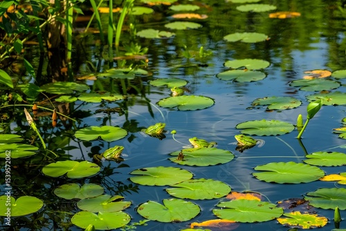frog, frog, green frog, duck pond, water, lily pad, lily pad, nature, wildlife, animal, animal, amphibian, amphibian, summer, daytime, sunlight, green, leaf, plant, plant, aquatic plant, aquatic, habitat, environment, ecosystem, calm, peaceful, serene, relaxing
