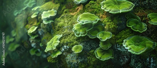 Green fungi algae adorning a rock wall perfect for using as a background or wallpaper in images with copy space
