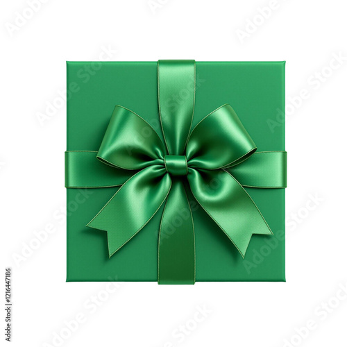 Green gift box with green silk ribbon bow on top view isolated on transparent background