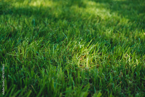 Green grass close-up. Lush cutted lawn with sun spot light. Fresh natural background. Blurred summer backdrop. 4K high quality photo.