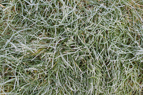 Green grass with morning frost and sun. Frosty morning. Quiet clear weather. Late autumn or early winter. Abstract background from a grass covered with hoarfrost.