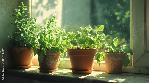 Green Herbal Plants in Terracotta Pots on Bright Sunny Windowsill