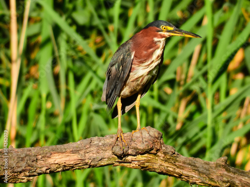 Green Heron Bird Perched on Broken Tree Log in Front of Cattails with Algae Bloom on Beak