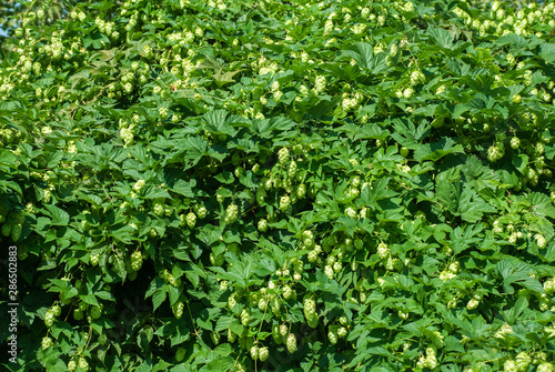Green hops close up. Green hops is beer ingredient. Green hops agriculture.