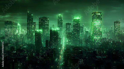 city, night, green, light, urban, building, skyscraper, illuminated, glow, dark, future, technology, digital, pixelated, retro, graphic, design, illustration, art, view, landscape, perspective, horizon, atmosphere, environment, scene, contemporary, modern, futuristic, electronic, illumination, night time, city landscape, pixel