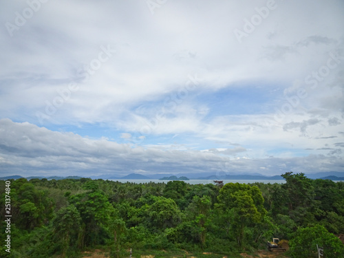 Green jungle and sea in the distance under a cloudy sky, Thailand.