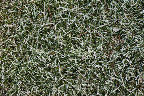 Green lawn after a morning frost. Natural background of grass covered with frost.