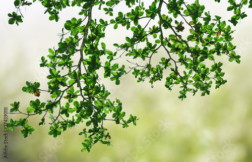 Green leaves and branches in spring season with blurry and foggy nature background.