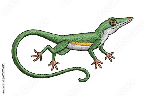 green lizard, embroidery, reptile, animal, nature, detailed, stitched, fabric, black background, yellow eyes, artistic, craft, illustration, wildlife, textured, decorative, unique, design, creative, small, intricate